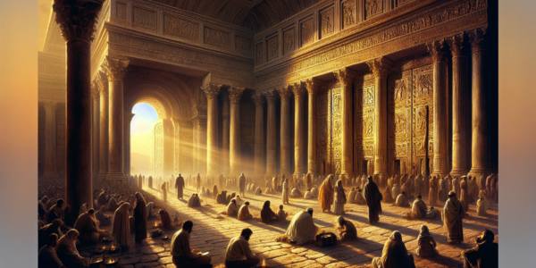 The afternoon sun, heavy and honey-gold, poured over the eastern wall of the Temple complex, pooling in the vast courtyard. It was the hour of prayer, the ninth hour, and a stream of people flowed toward the Beautiful Gate—a double…