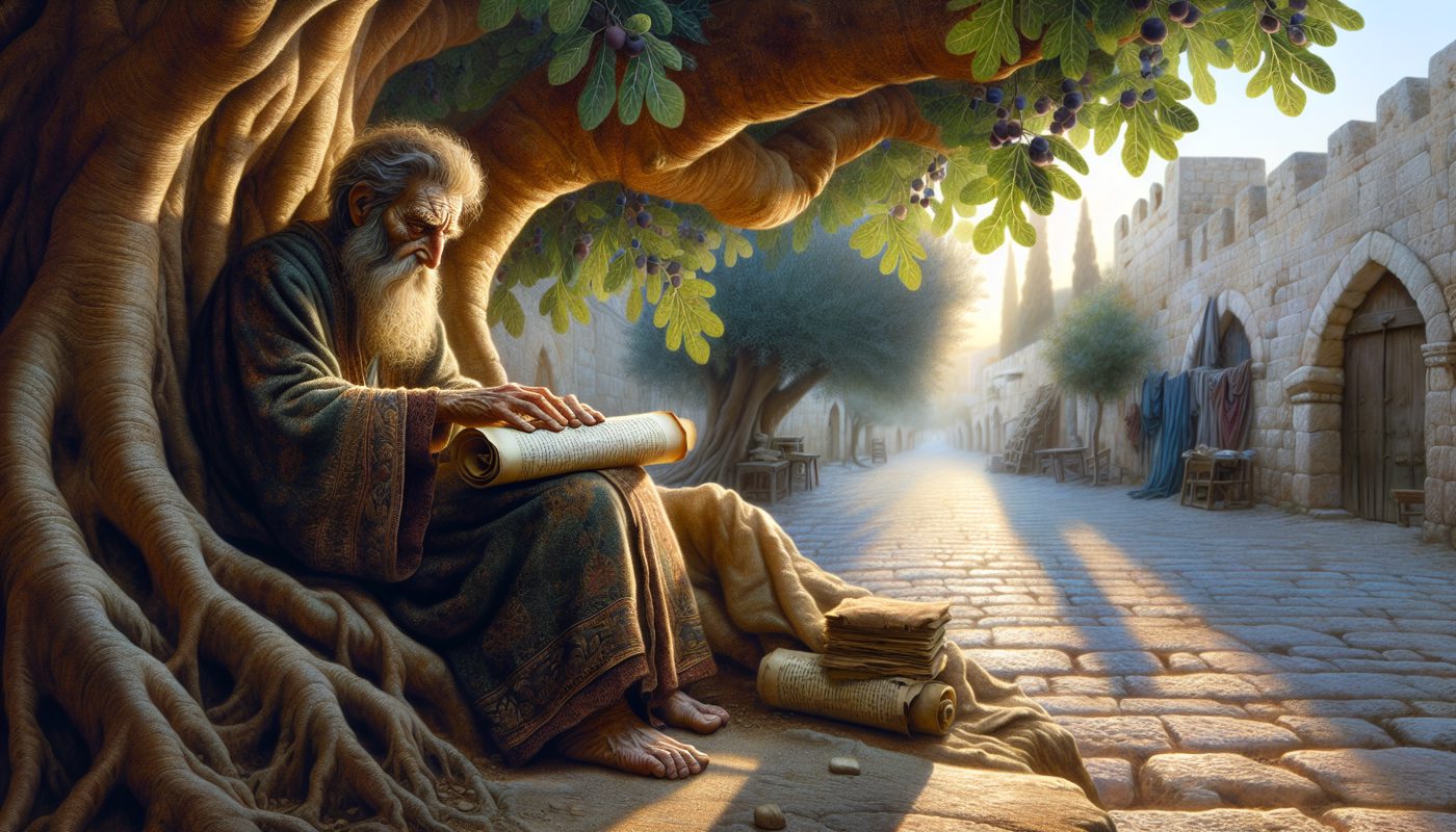 The sun hung low in the sky, casting long shadows over the quiet streets of Jerusalem. The air was thick with the scent of olive trees and the distant murmur of merchants closing their stalls. In the shade of an ancient fig tree, an old man sat with a scroll unfurled across his lap. His hands, gnarled with age, trembled slightly as he traced the words written there—words he had penned many years before under the inspiration of the Almighty.