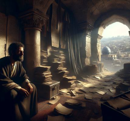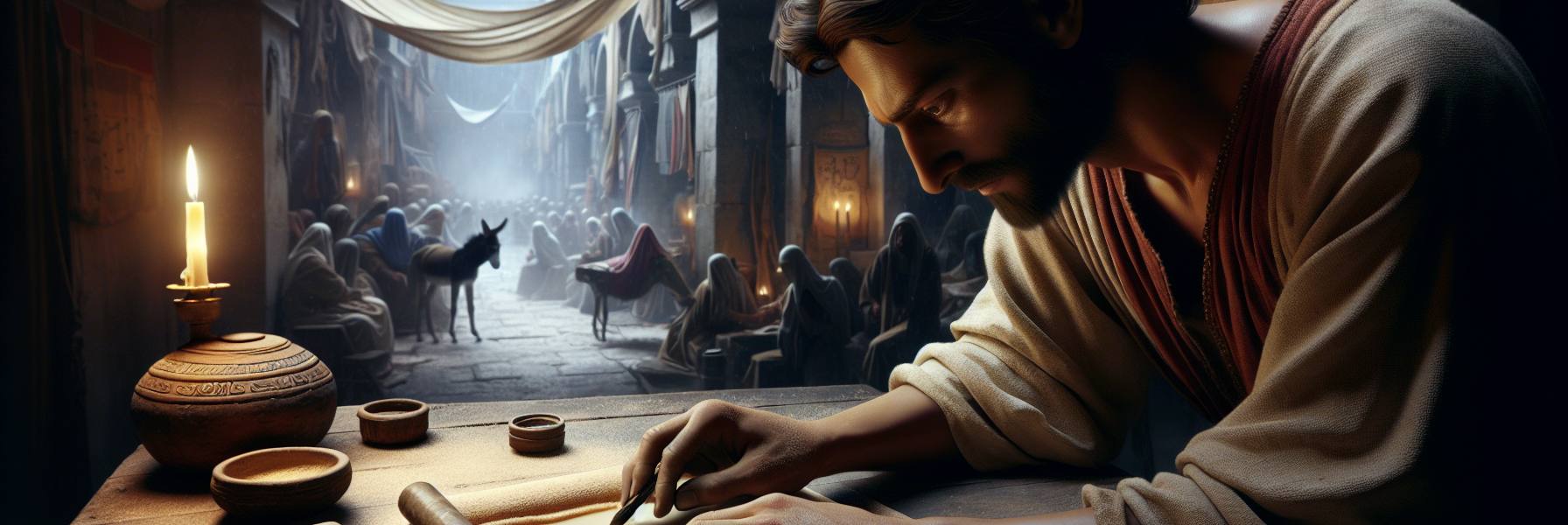 Outside, the sounds of Jerusalem filtered through the shuttered window—a donkey’s bray, a merchant’s final cry of the day, the distant notes of a prayer. He pushed the tablet away, the heel of his hand coming to rest in the soft dust on the table. Justification. A legal term, clean and decisive. But his own soul felt like the dust—shifting, unsettled. He thought of the Law, the relentless ledger of his life. Every inflection of anger, every glance of envy, every silent omission. He had kept track, a miserable accountant of his own failures. The balance was, and always would be, irrevocably in the red.