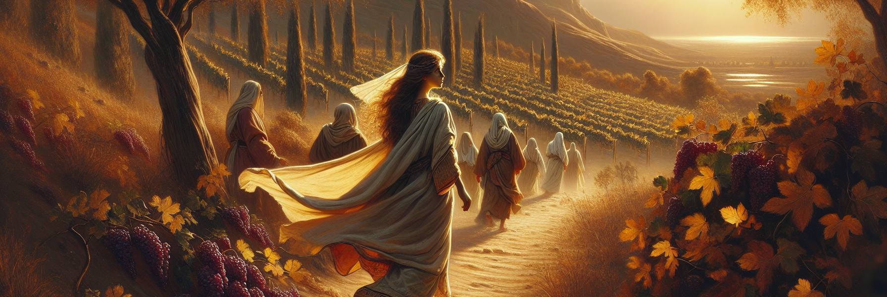 She squeezed my hand. “I have stored them up for you, my beloved.” She meant the fruits, the seasons, the days, the love. All of it, kept and waiting. And we turned together, leaving the path, walking into the shadow of the vineyard rows as the world turned to silver and dusk.