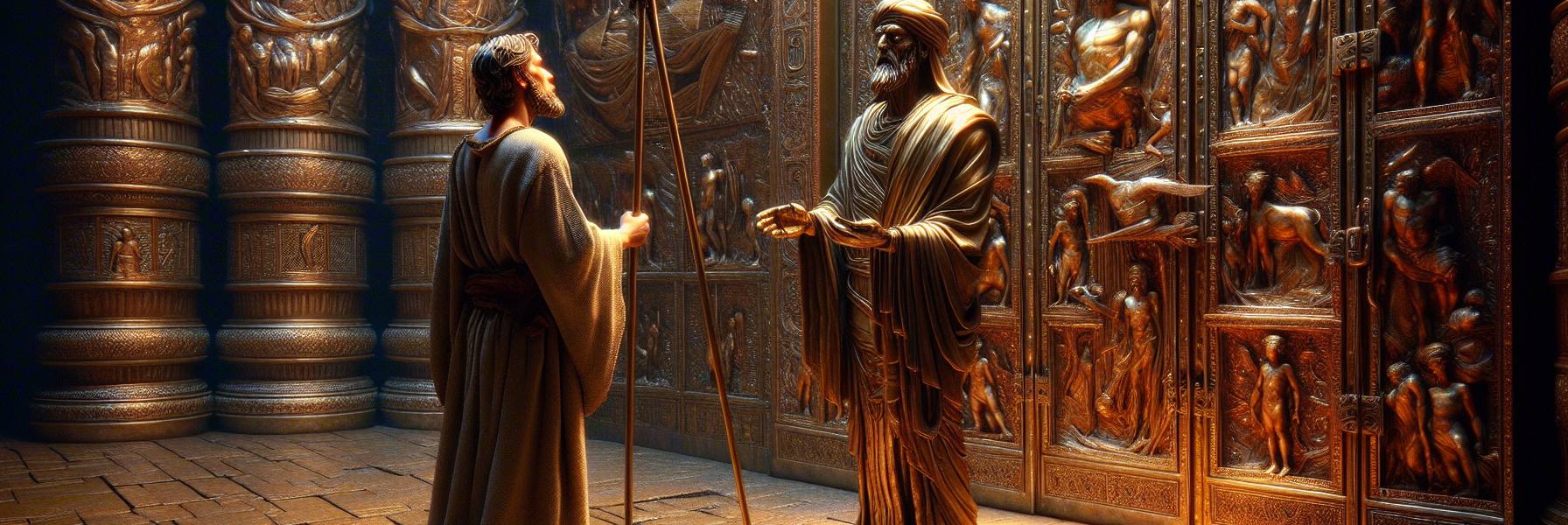 We walked back through the outer court, past the silent, gleaming walls, until we stood once more at the eastern gate. But the gate was shut. I remembered it from before, a massive, sealed thing. Yet as we approached, I heard not a creak of hinge, but a sound like a sigh, and the doors, of their own accord, parted just enough for us to pass. We stepped through, and they closed behind us with a final, soft thud.