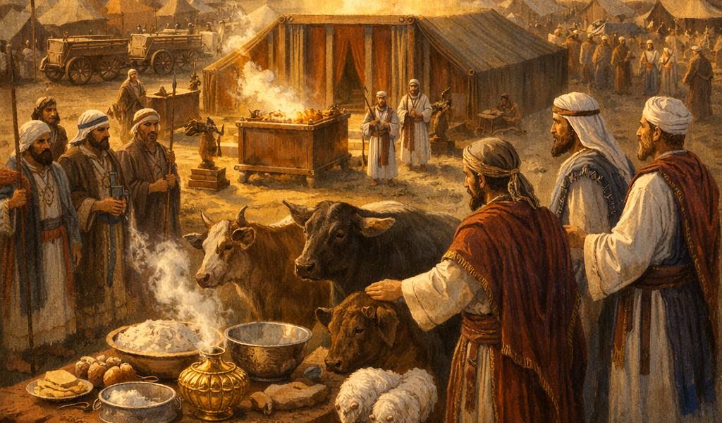And Moses did not merely tally them. He watched as Nahshon’s hands, calloused from leading a people through wilderness, rested for a moment on the bull’s flank. He saw the man’s eyes lift to the silent, clouded presence over the Most Holy Place. This was not a transaction. It was a language. The silver spoke of redemption, the grain of daily dependence, the incense of prayers meant to ascend where eyes could not see, the blood of atonement and communion. It was a grammar of grace, repeated.