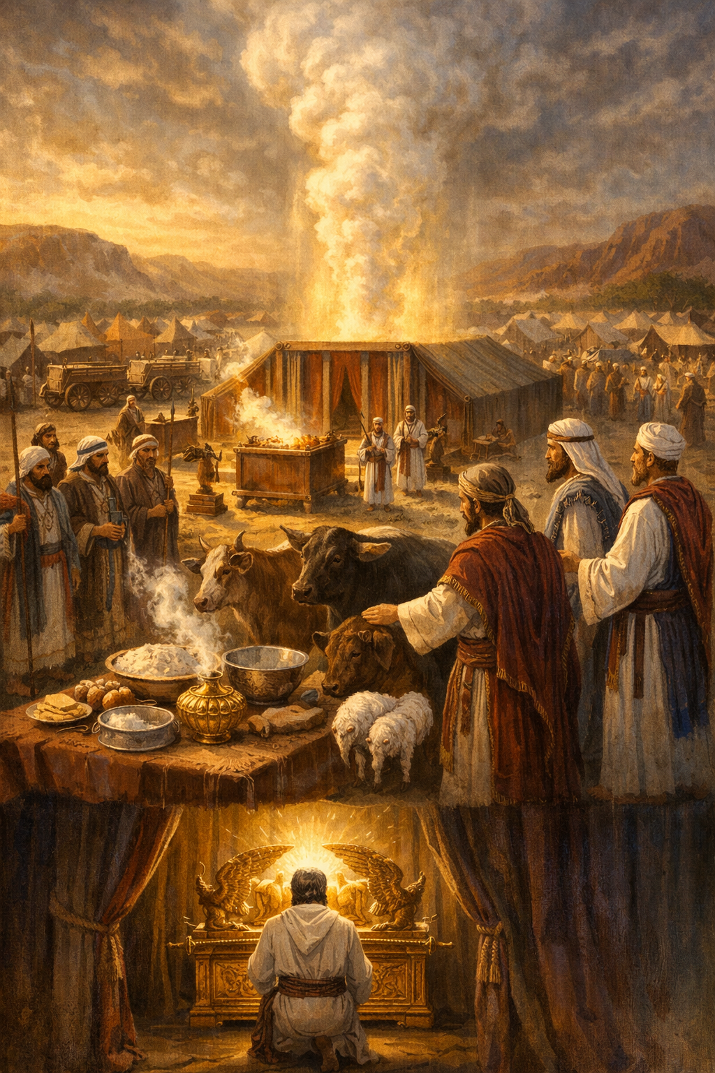 The tabernacle stood finished. Moses had anointed it, sanctified it, and every vessel and the altar itself. The work of setting up was complete. On that same day, the princes of Israel, the heads of their fathers' houses, the men who had overseen the census, came forward. They brought an oblation before the Lord: six covered wagons and twelve oxen. A wagon for every two princes, an ox for each one. They presented them before the tabernacle.