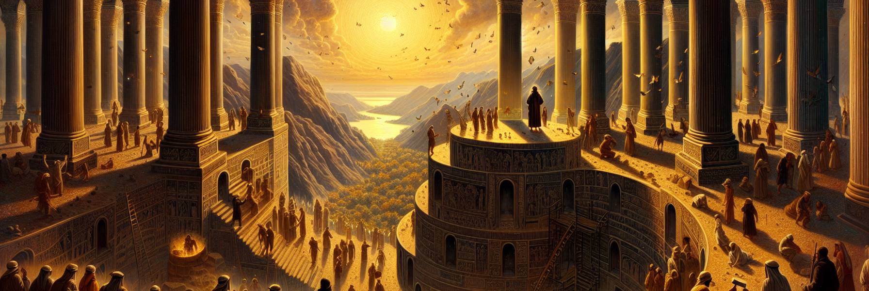He walked out into the noisy yard, the din a shock after the silent intensity of the inner shrine. The two pillars, Jachin and Boaz, were being raised at the portico. Their bronze capitals, seven cubits high, were a maze of pomegranates and lotus blossoms, a burst of fertile life cast in unforgiving metal. He placed his hand on the warm bronze of Boaz. “In Him is strength,” he whispered. The pillar stood firm.