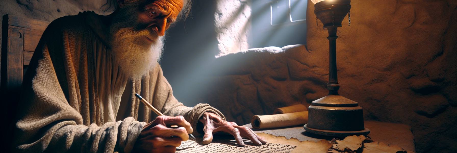 He was an old man now, his bones ached with the damp that seeped up from the stones, and his eyes strained in the poor light. But the task kept him awake. The letter from Paul lay beside him, the papyrus worn soft at the creases from handling. He knew its contents almost by heart, but he read it again, the words settling into him with a cold, familiar weight.