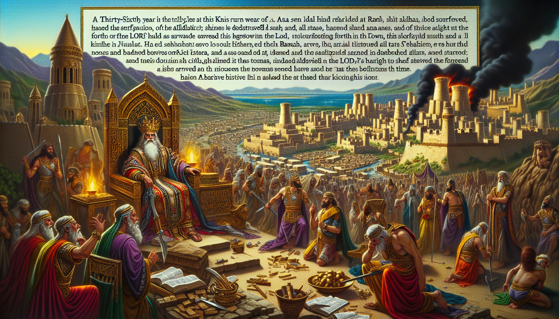 犹大王亚撒在位已有三十六年,他的统治曾因对耶和华的忠诚而蒙福。早年,他废除了国中的偶像,命令百姓寻求耶和华他们列祖的神,并遵行他的律法与诫命。因此,神赐他平安,使犹大在多年间不受外敌侵扰。