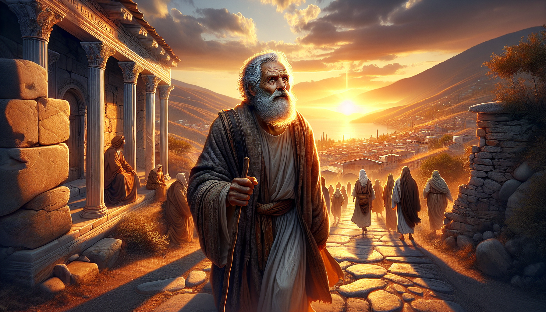 在古老的以弗所城,夕阳的余晖洒落在狭窄的石板街道上,金色的光芒透过橄榄树的枝叶,斑驳地映照在聚集的信徒们身上。年迈的使徒约翰坐在一块平整的石头上,他的眼神深邃而温柔,手中握着一卷羊皮纸。周围的人们屏息凝神,等待这位曾与耶稣同行的老人开口。