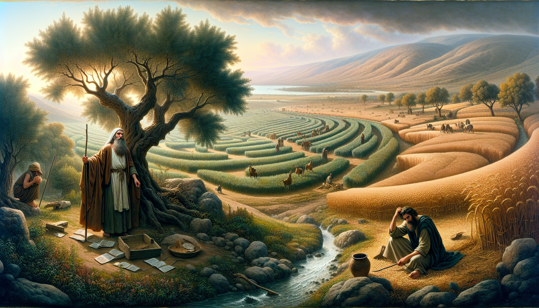 在犹大群山环绕的一个小村庄里,住着一位名叫以利法的农夫。他为人勤劳正直,每日清晨便起身耕种田地,细心照料橄榄树和葡萄园。他的妻子亚比该也贤惠聪颖,善于持家,常常用智慧的话语教导他们的孩子。以利法一家虽不富裕,却因敬畏耶和华而蒙福,生活安稳喜乐。