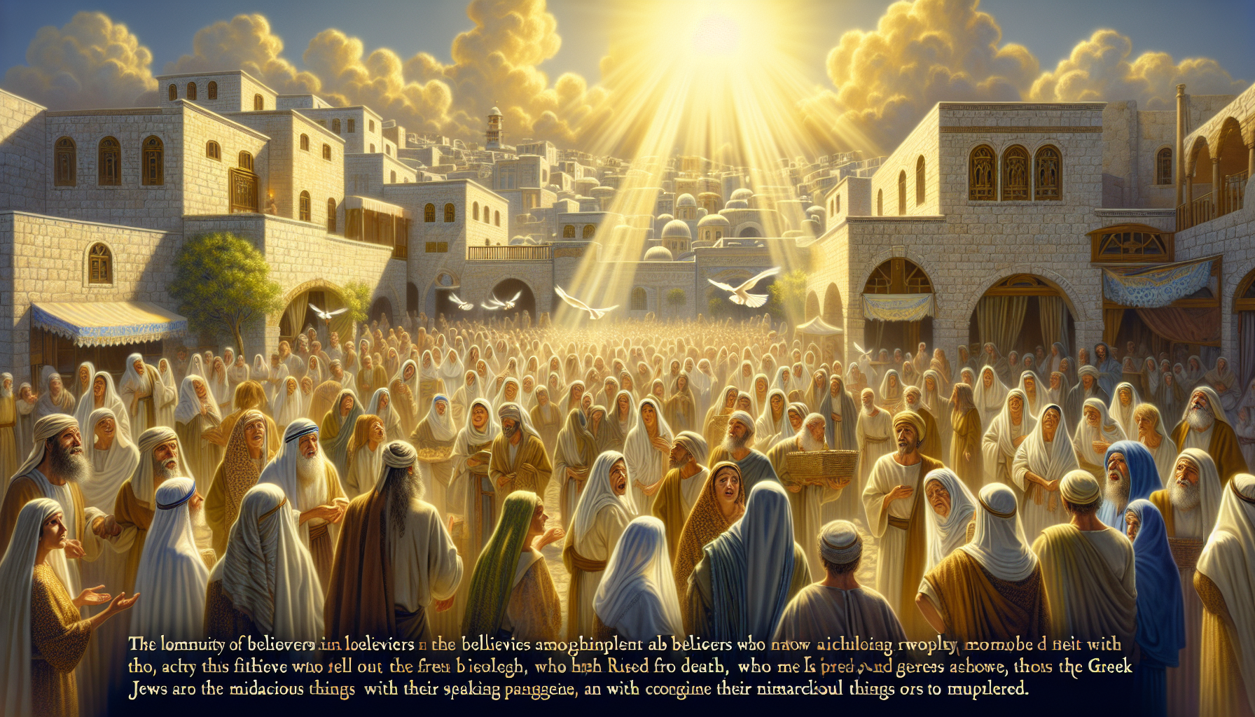 在耶路撒冷,初代教会的信徒们日日增多,神的道如春雨滋润人心,福音的火炬照亮了这座古老的圣城。然而,随着门徒的数量不断增长,教会内部也开始出现一些细微的裂痕。