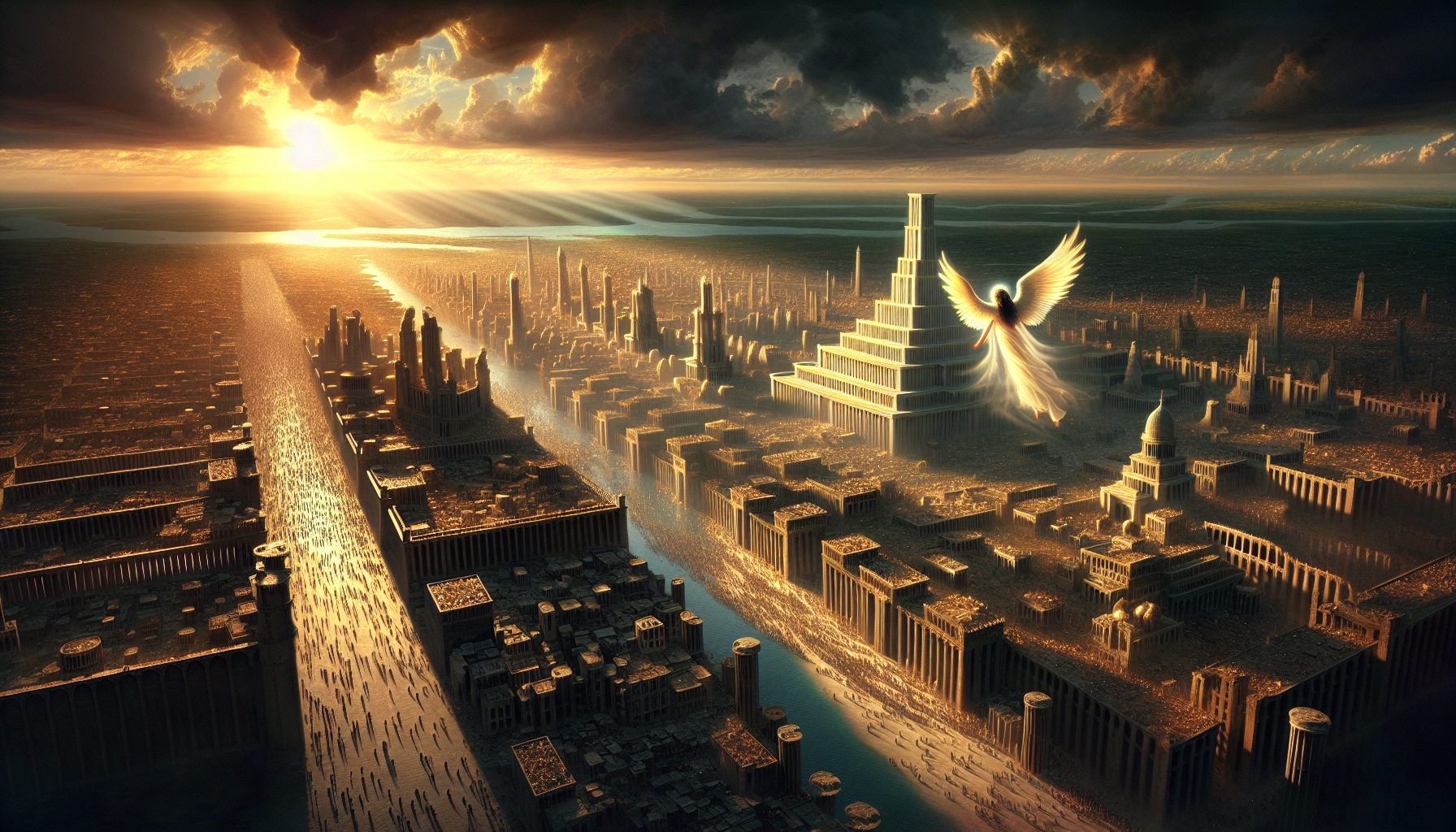 **《启示录第十八章:巴比伦的倾覆》** 那日,天使从天而降,身披荣光,手持火炬,照亮了黑暗的天地。他声音如雷,震撼万国,宣告说:“巴比伦大城倾倒了!倾倒了!成了鬼魔...