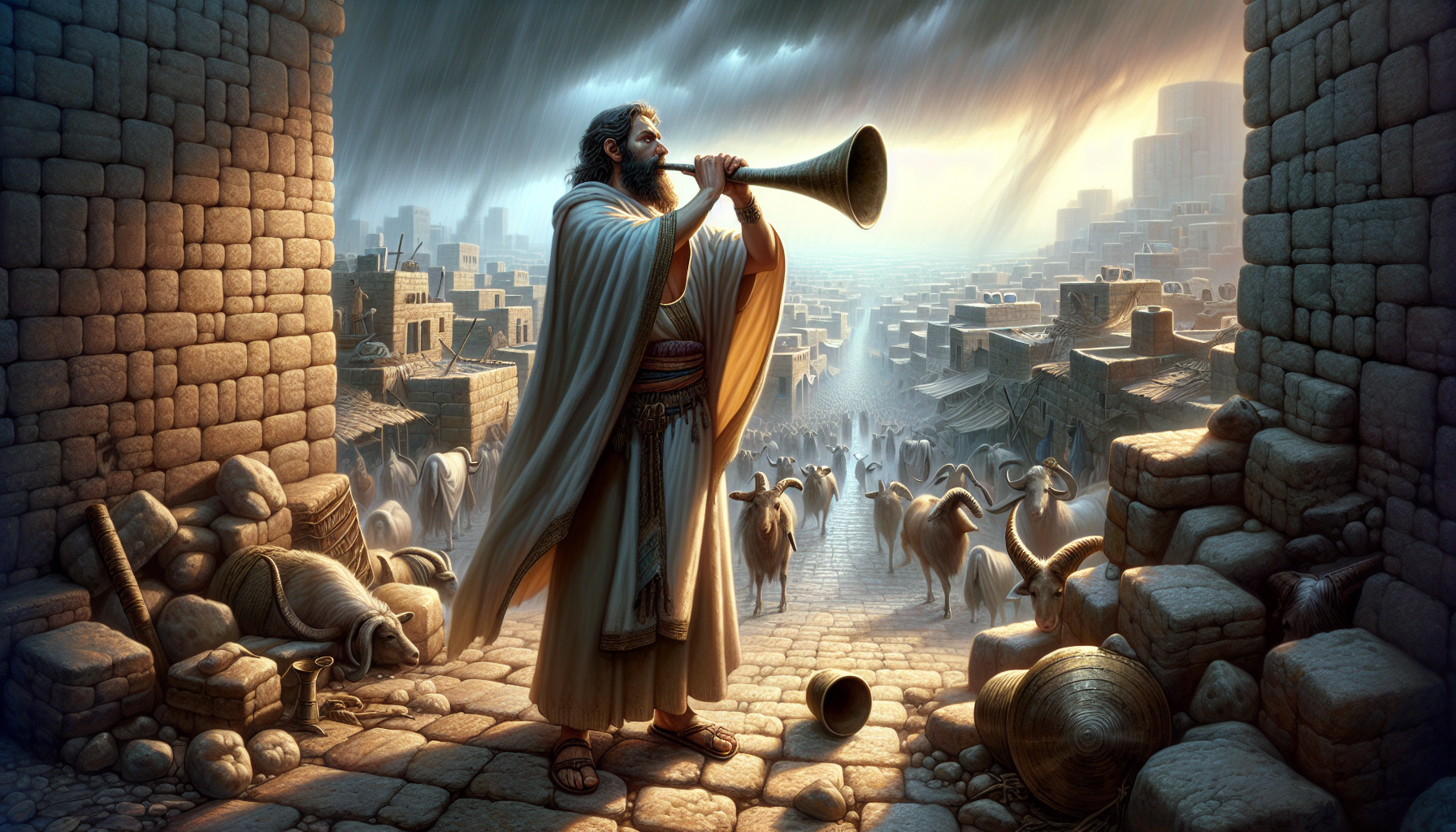 黄昏时我爬上城墙的残破处。西边的太阳正往下沉,把整个撒玛利亚染成凝血的颜色。风突然大了,卷起广场上的尘土、碎草和祭祀后剩下的灰烬。它们在半空中打旋,久久不肯落下。一个牧童赶着羊群从城门进来,羊铃叮当乱响,在暮色里显得格外清冷。有只羔羊瘸了腿,跟不上队伍。