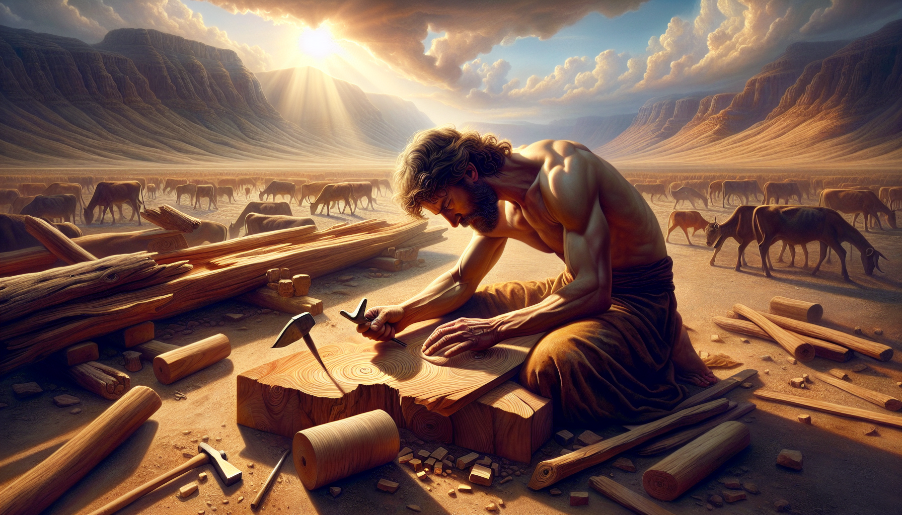 日头渐渐偏西,西奈山的轮廓在灼热的空气中微微颤动。比撒列用沾满石粉的手臂擦了擦额角的汗,指尖触到粗麻头巾粗糙的纹理。他的帐篷里弥漫着木头、金属和皮革混合的气味——那是他父亲传给他的手艺,是流在便雅悯支派血脉里的技艺。他刚打磨完一块皂荚木,木纹在油灯的映照下泛着温润的光泽。就在这时,帐外的光,变了。