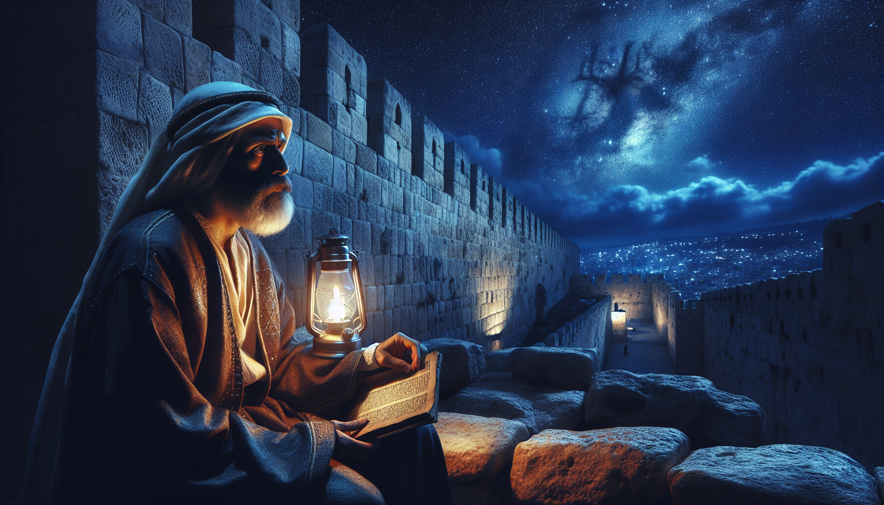 他静静地站着,成了一个剪影。他的祷告,如同一声叹息,融进了耶路撒冷的夜风里,飘向那垂听者耳中。他知道,胜负不在于城墙的厚薄,兵卒的多寡,而在于那名是否仍然看顾这地。而历史,那部由神亲自书写的长卷,曾翻过更黑暗的篇章。他,和他的城,不过是这卷中待写的一行。他选择了信靠那执笔的手。