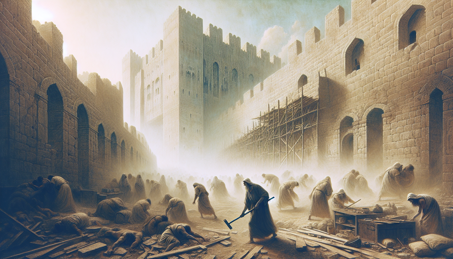 铜尺是冰凉的,指节抵在上面久了,隐隐发麻。哈拿尼靠着半截斑驳的石墙,望着眼前这片杂乱无章的家园——耶路撒冷,名字依然尊贵,身形却像一个被扯烂又被胡乱缝补的麻袋。归回的人,像他一样,眼里燃着火,手上却满是无力。城墙依然断裂着,如同一个未愈的伤口,裸露在迦南地的风里。