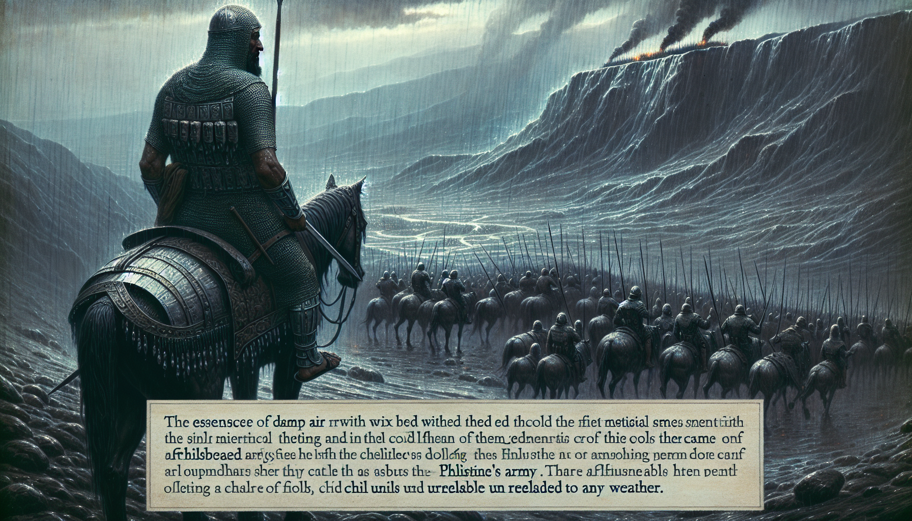 基利波的山风带着铁锈与尘土的气味。那是血的味道,也是败亡的味道。扫罗王伏在刀上,沉重的甲胄压得他喘不过气。非利士人的呐喊像潮水般从山下涌来,一阵高过一阵。他抬眼望去,看见自己的军队如同被镰刀割过的麦子,成片地倒伏在崎岖的山岩之间。三个儿子——约拿单、亚比拿达、麦基舒亚——他已经看不见他们的身影了。也许早就倒在了某块灰色的石头后面,和他那些忠诚又恐惧的士兵一样。