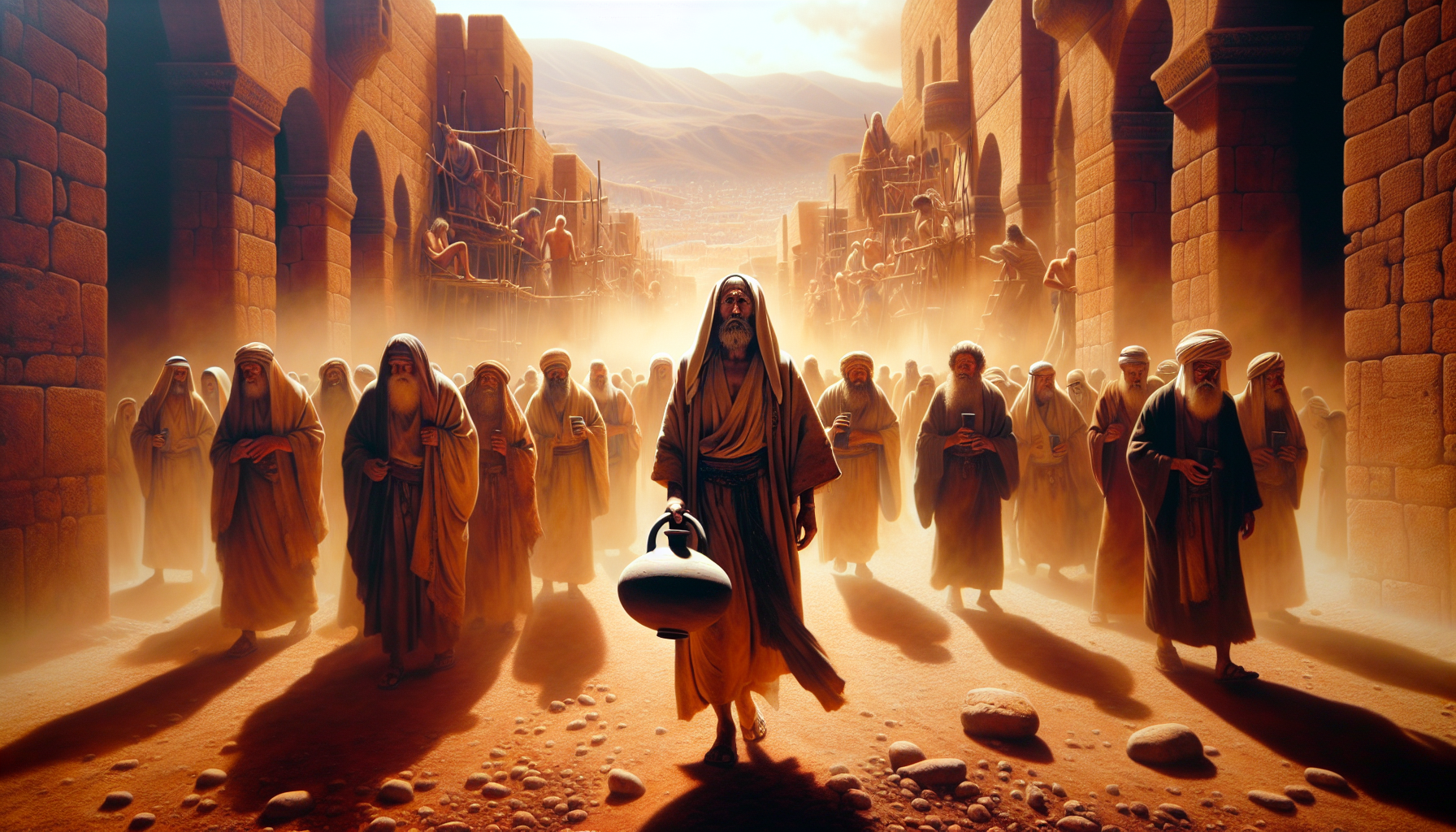 耶利米没有立刻开口。他先是将那瓦瓶小心地放在脚边一块略平的石上,然后转过身,面对着那座城——那蒙着淡金色尘埃的耶路撒冷。他的声音起初有些干涩,像是许久未用的门轴,但很快便沉了下来,带着谷地回音的那种重量: