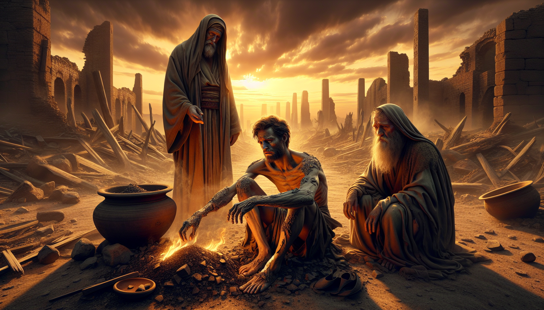 En la tierra de Uz, donde el sol abrasador doraba las llanuras y los vientos cálidos susurraban entre las tiendas de los hombres, Job, un hombre íntegro y recto, se encontraba sumido en una profunda aflicción. Había perdido sus riquezas, sus hijos y su salud, y ahora, sentado sobre cenizas, rascaba sus llagas con un tiesto mientras sus amigos lo rodeaban en silencio.