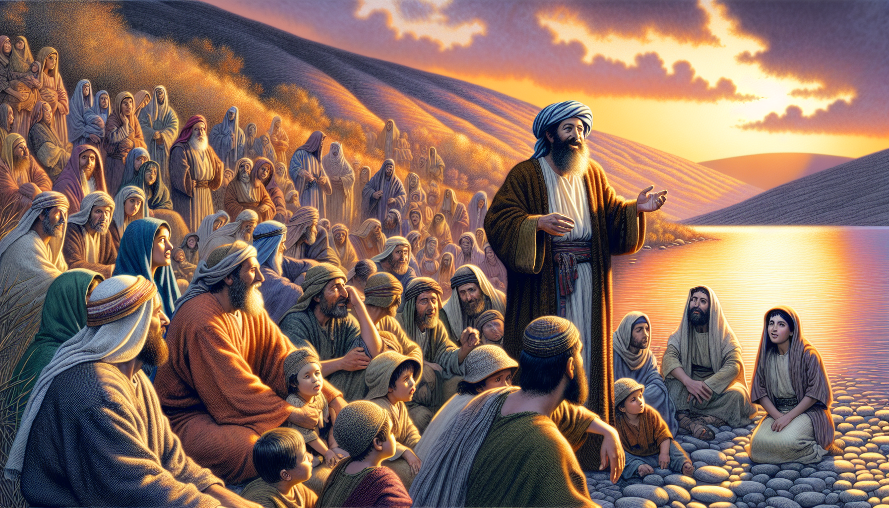 El sol comenzaba a declinar sobre las colinas de Galilea, pintando el cielo de tonos dorados y púrpuras. Jesús, rodeado de sus discípulos y una multitud que había crecido como la espuma del mar, se sentó junto a la orilla del lago de Genesaret. Las olas murmuraban suavemente contra las piedras, como si la creación misma anhelara escuchar sus palabras.
