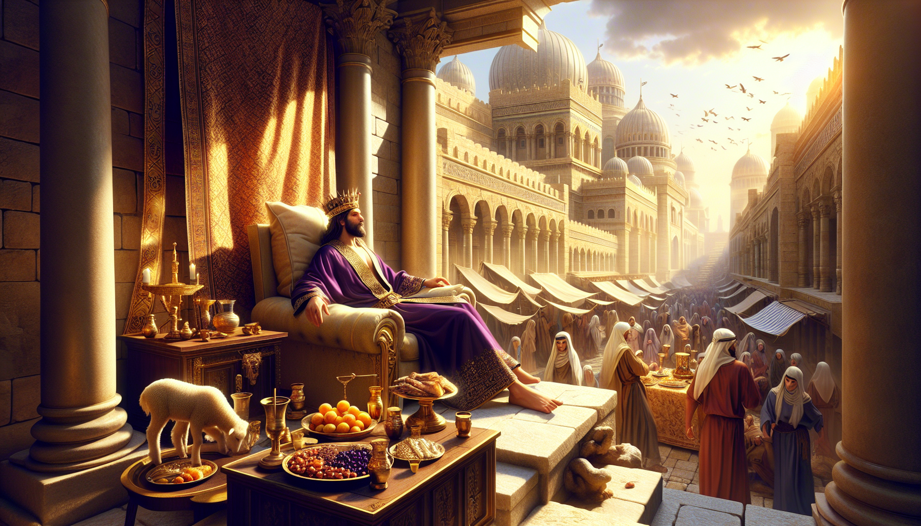 Tobia, allongé sur un divan, leva sa coupe en disant : « Buvons à notre gloire ! Qui donc est plus puissant que nous en Israël ? Nos greniers sont pleins, nos armées invincibles, et le temple de Béthel protège notre nation. » Les convives applaudirent, se délectant de leurs illusions.
