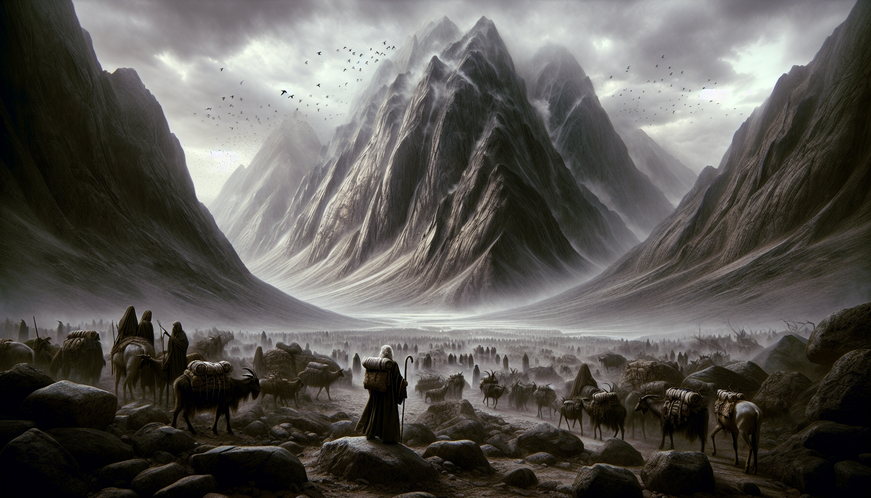 Moïse gravit la montagne, lentement, sans hâte. La pente était raide, semée de cailloux qui roulaient sous ses sandales. Il savait qu’il devait monter vers le Seigneur, comme Il le lui avait ordonné. À mi-hauteur, il s’arrêta un instant, le souffle court, et regarda en bas. Le camp s’étalait dans la vallée, une mer de tentes pâles, de feux naissants, de bêtes et d’hommes minuscules. Une étrange émotion l’étreignit : ce peuple, si lourd à porter, si prompt à murmurer, était pourtant celui que Dieu avait choisi.