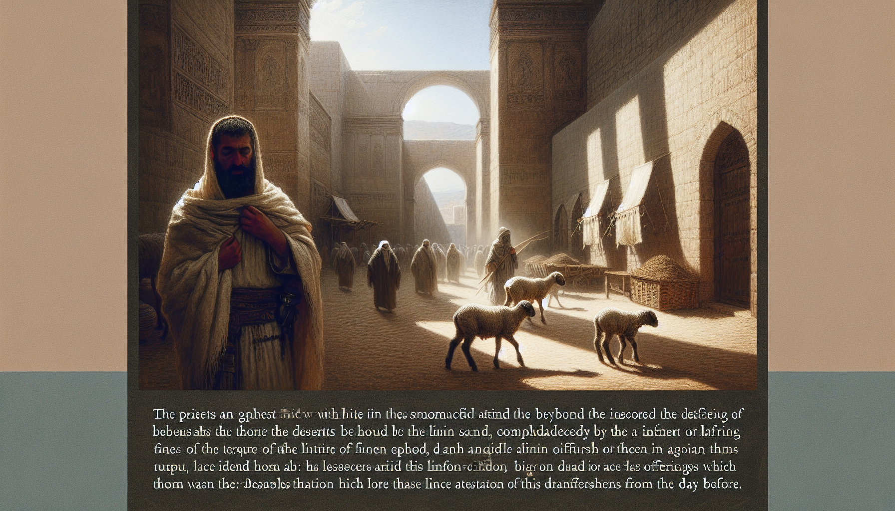 Quand son tour vint, ses paumes devinrent moites. Un prêtre, un lévite au visage buriné par le soleil et la fumée sacrée, s’approcha. Ses vêtements de lin simple étaient tachés à certains endroits d’une sombre patine. Sans un mot, Éliézer guida le taureau jusqu’à l’endroit désigné, face à l’entrée nord de l’enceinte. La splendeur des tentures tissées, les reflets de l’or et du bronze, tout cela formait un contraste saisissant avec la terre battue sous ses pieds.