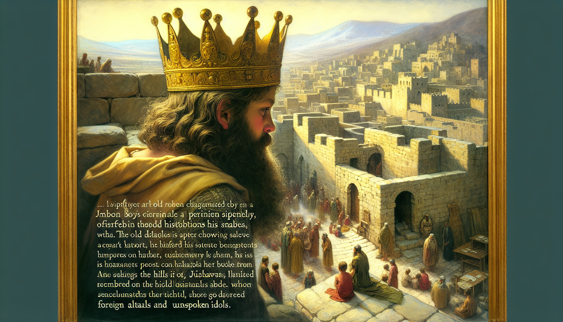 Puis, à l’orée de sa seizième année, quelque chose remua dans le cœur du jeune homme. Ce ne fut pas un éclair, mais une lente et tenace conviction, comme une source qui trouve enfin son chemin à travers la roche. Peut-être en écoutant un vieux prêtre murmurer des récits du temps de David, peut-être en regardant, un soir, la ligne pure des collines de Judée sans la souillure d’un ashérah. Il se mit à chercher. Non pas le Dieu de son père Amon, ni de son grand-père Manassé, mais le Dieu d’Abraham, d’Isaac et de Jacob. Celui dont la loi était enfouie sous la poussière de l’indifférence et le poids du mensonge.