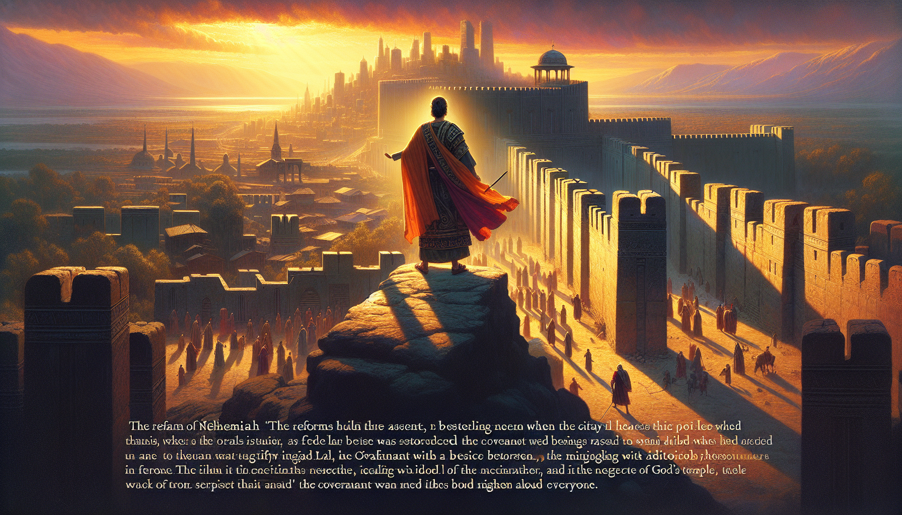 エルサレムの城壁が完成し、民が喜びに満ちていたある日、ネヘミヤはペルシャの王アルタシャスタのもとへ一時的に帰還することを余儀なくされた。王に仕える役目を果たすためであった。しかし、ネヘミヤの不在中、エルサレムでは再び人々の信仰が揺らぎ始めた。