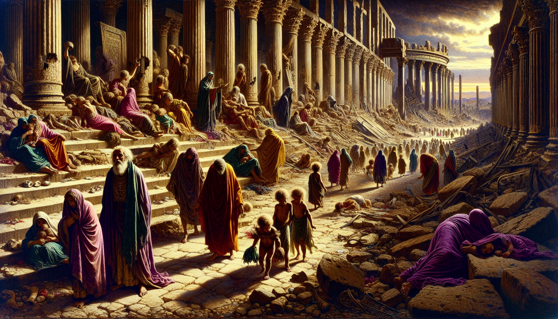 かつて栄光に満ちていたエルサレムの町は、今や廃墟と化していた。黄金のように輝いていた神殿の石は黒く焼け焦げ、通りには死の影が覆いかぶさっていた。人々は飢えに苦しみ、幼子たちは母親の胸にすがっても、乳は枯れ尽きていた。
