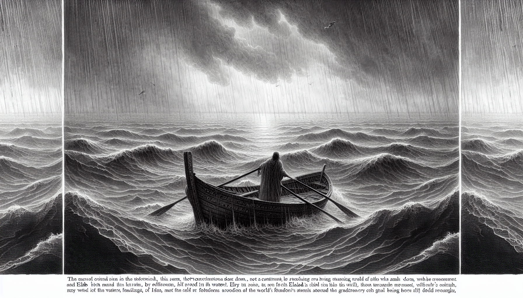 波は山となり、谷となった。轟音は、天と地の隙間を埋め尽くす。雷鳴が湖面を殴りつけ、稲妻が一瞬、狂ったような水面の表情を白日のもとに曝す。それは、圧倒的な力の示威行為だった。秩序などない。混沌が、全てを飲み込もうとしている。エリアブは息を呑んだ。この轟き、この怒涛は、世界の根底が揺さぶられているようだった。太古から、世界はこのような洪水の鬨の声に満ちていたのではないか。人の国々の興亡、王たちの栄華、すべてこの荒れ狂う水の前では、泡のように儚く消えてしまう。彼は思った。これが、世の全ての力の究極の姿なのか、と。