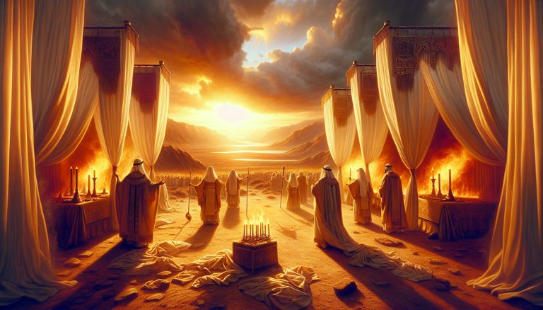 **聖書物語:レビ記10章「ナダブとアビフの裁き」** 燃えるような太陽がシナイの荒野を照らす中、神の民イスラエルは、聖なる幕屋の周りに集まっていた。モーセとアロンは、...