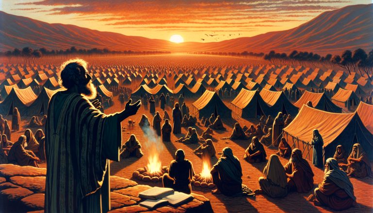 **出エジプト記18章:エトロの訪問と知恵の共有** 荒野の太陽が砂漠の地平線に沈み、燃えるような夕焼けがシナイの山々を赤く染めていた。モーセは天幕の前で座り、疲れた体...