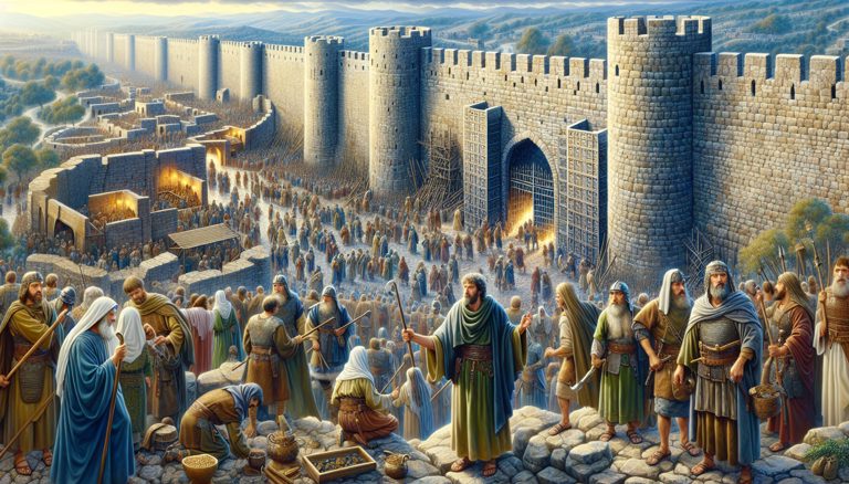 **ネヘミヤ記7章:エルサレムの守りと民の登録** エルサレムの城壁がついに完成した日のことである。太陽が西の山々に沈み、金色の光が石垣の上に輝いていた。ネヘミヤは高...
