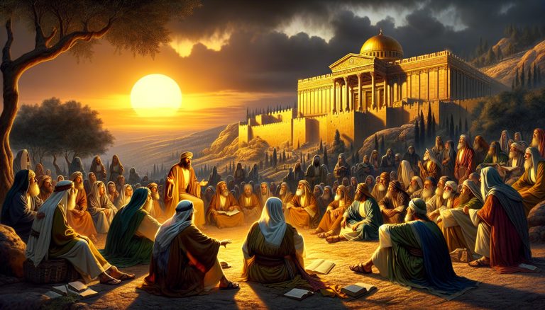**詩篇123篇に基づく物語** **題:主を仰ぎ見る民の祈り** エルサレムの丘に夕日が沈み、金色の光が神殿の壁を優しく照らしていた。人々の一日の労働が終わりを告げる頃、街の...
