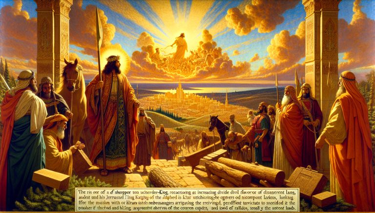 **歴代誌第一 14章に基づく物語** ダビデはついに、神が約束された通り、イスラエルの王として全イスラエルの前に立てられた。彼はエルサレム、すなわち「シオンの都」を治め...