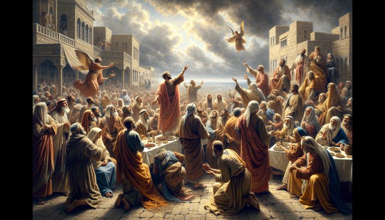 **知恵と正義の道:箴言11章の物語** ある日のこと、エルサレムの丘に朝日が昇り、黄金の光が街の石畳を照らした。市場は早くも活気づき、商人たちが商品を並べ、人々が買い...