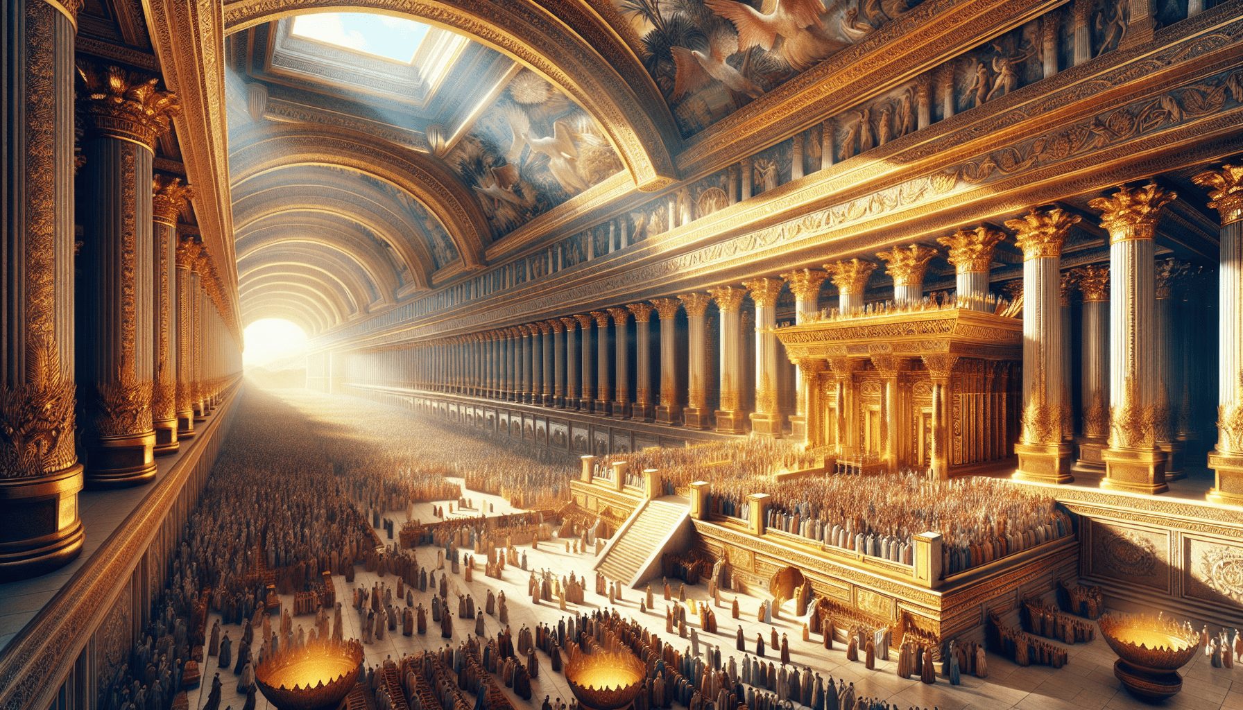 No segundo ano do reinado de Salomão, o grande templo que ele havia construído para o Senhor estava finalmente completo. Era uma obra magnífica, uma expressão de devoção e reverência ao Deus de Israel. As paredes de pedra reluziam sob o sol, e o ouro que revestia o interior do santuário brilhava como se refletisse a própria glória divina. O povo de Israel se reuniu em Jerusalém para celebrar a conclusão daquele projeto sagrado, e o ar estava carregado de expectativa e alegria.