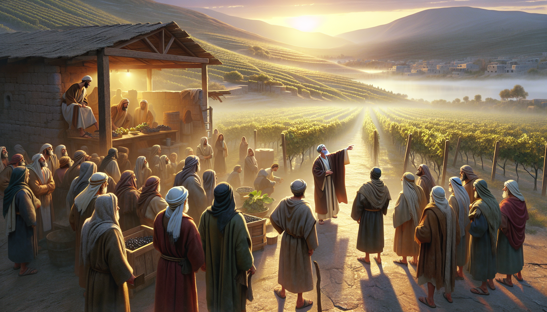Foi então que o dono de uma grande vinha, um homem bondoso e justo, chegou à praça. Seus olhos eram cheios de compaixão ao ver aqueles trabalhadores sedentos de oportunidade.